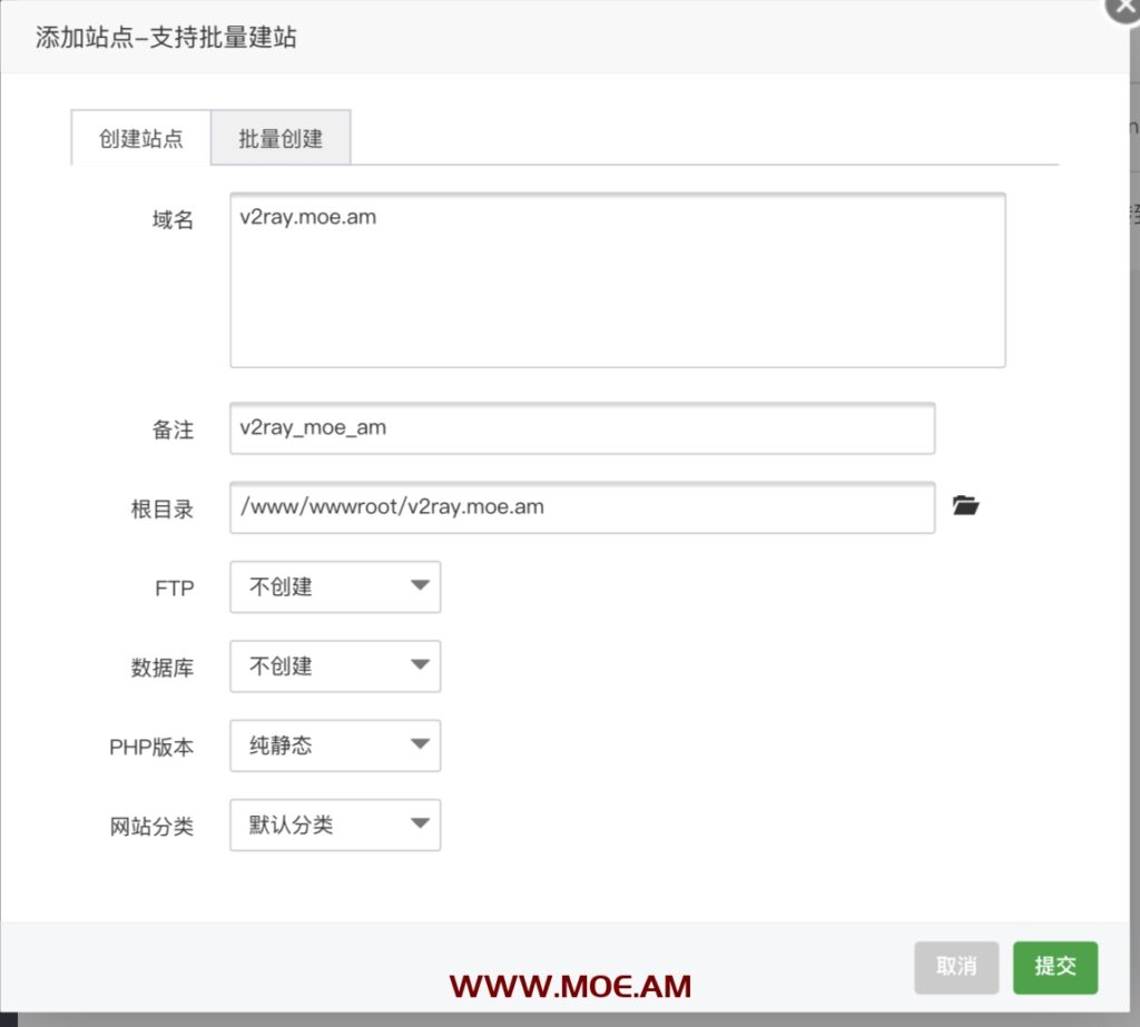 然后宝塔新建一个网站(域名是文章开头你解析的),如下图所示(数据库,PHP都无所谓)