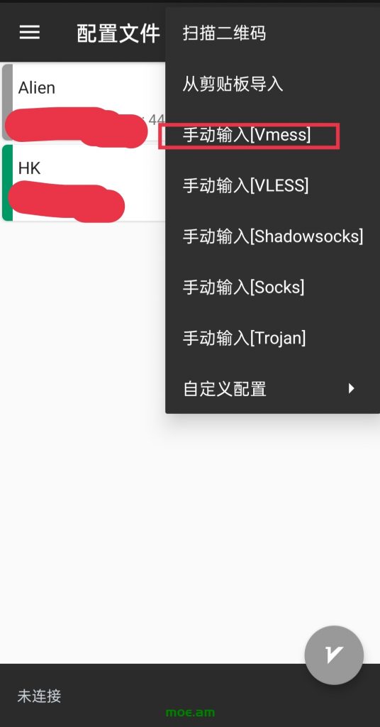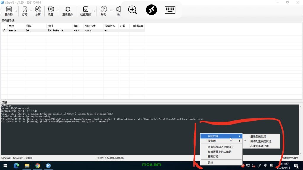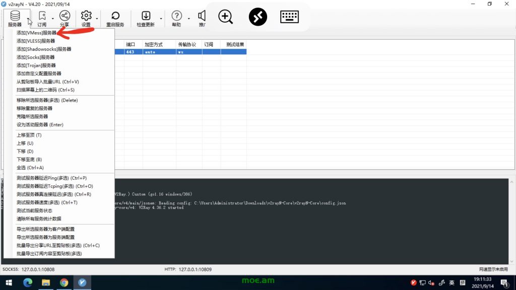 V2rayN左上角点击服务器,添加Vmess协议,配置就按照上面安卓的照葫芦画瓢