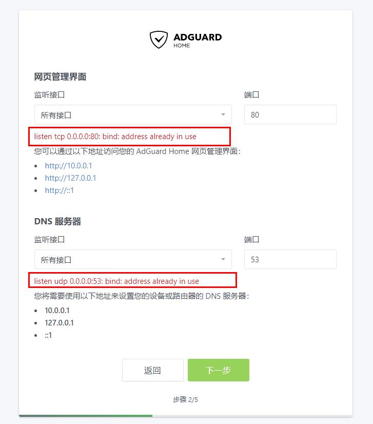 请检查服务器的80以及53端口是否冲突,这两个端口程序需要使用。