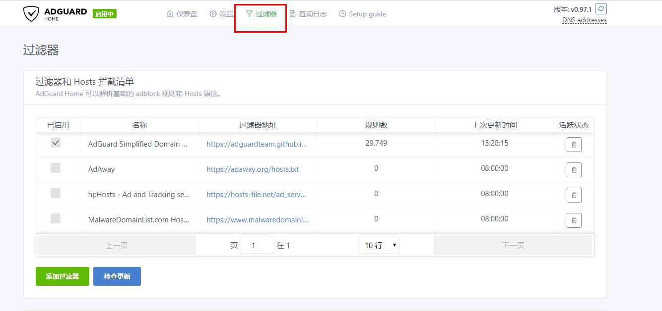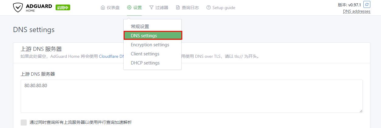 #启动 systemctl start AdGuardHome #开机自启 systemctl enable AdGuardHome #重启 systemctl restart AdGuardHome #停止 systemctl stop AdGuardHome