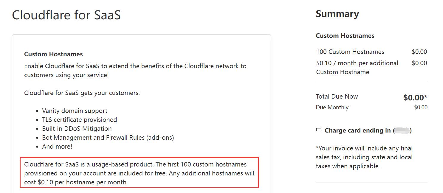 CloudFlare for SaaS不是个新功能,这里单独拿出来讲,主要是几天前CF调整了一波免费额度。过去是每个域名收取2USD/月的费用,现在不仅提供100个域名免费额度,而且超额后每个域名按0.1USD/月收取费用,非常良心。