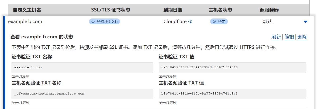 添加完成后,按要求解析证书和主机名两个TXT记录,解析生效后10分钟左右即可验证通过,到此这个SaaS域名就正确的添加到了你的zone中并接入了CF。