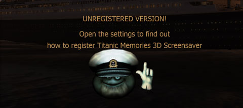 Titanic Memories 3D Screensaver包括3D泰坦尼克号桌面和3D泰坦尼克号屏保,未注册的情况下,桌面会出现提示注册信息。