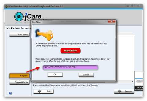Step 2 – 安装完毕后,运行iCare data Recovery Software,随便选择其中一个恢复模式进入,选择“Register”,输入有效序列号“CQBPDUO9BA7BH4IJFUVXDC6F24JJ68DX”,点击OK即可激活。