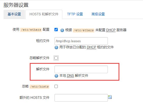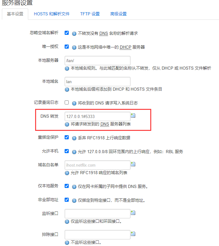 dnsmasq绑定53端口,在DHCP/DNS中的DNS转发项和解析文件项中可以设置dnsmasq的上游服务器。