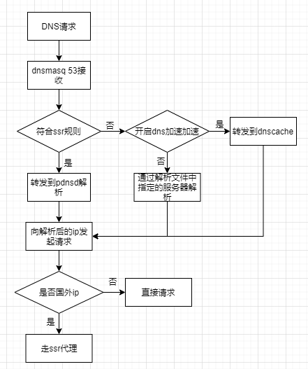 按自己之前的理解,开启绕过中国大陆模式后是不应该出现这个问题的,为了搞清楚原因,摸索了下Lean大openwrt的dns解析流程。