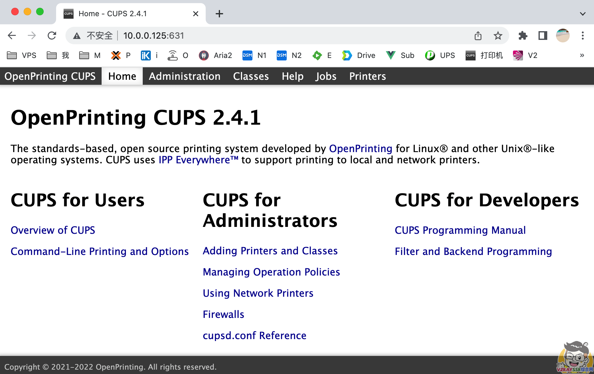 现在,可以访问 http://群辉IP:631 ,看到 CUPS 的 WEB 管理界面了。