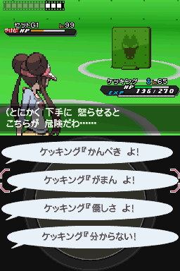 一开始朝北鼻用电磁波,依靠坚硬特性撑住(如果对方没有麻痹不能动就一直用忍耐,有麻痹则用痛苦平分),第二回合用忍耐再撑住,之后台词选择