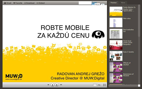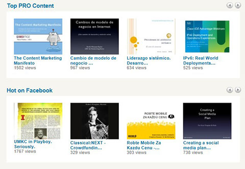 Slideshare是一个开放式的免费服务平台,只要注册后的使用者,都可将ppt、word、excel上传,并加上标签,让大家透过 Slideshare的平台观看。它还可让用户选择,是否允许读者下载档案。目前Slideshare是全球最大的ppt分享网站。目前该网站开通支持 word、excel文档,相信将来word、excel的分享量也会增加。很多国外专家都开始将研讨会上的主题演讲放上去了,可以说是一个国际化的分享 平台,例如加拿大数位学习专家Stephen Downes,就上传了一百个以上的简报资料,而且档案都可以下载。