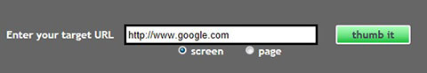 Step 1 – 打开thumbalizr.com,输入你需要截取的网页的地址,选择你要截取的内容(screen指的是屏幕显示的网页页面,page指的是整个网页页面),点击thum it 按钮;