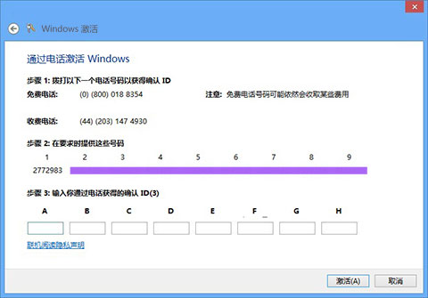 通过电话激活,都可以拨打微软的每个国家设置的免费激活服务电话。如果你是购买了国 内的产品密钥,选择中国地区,拨打微软中国地区的免费电话,根据提示输入激活界面的数字,则可得到一串ID。但如果你使用的不是中国地区的产品密钥(网上 流传的一般都不行),则极有可能无法通过微软中国的免费电话进行激活,而是需要拨打国外的电话激活。如何拨打微软国外的免费电话激活Windows 8呢?