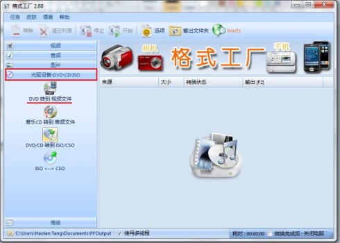 打开格式工厂,左侧选项选择“光驱设备/DVD/CD/ISO”中“DVD转到视频文件”(见下图)