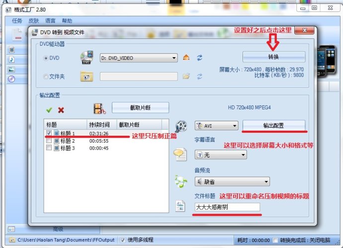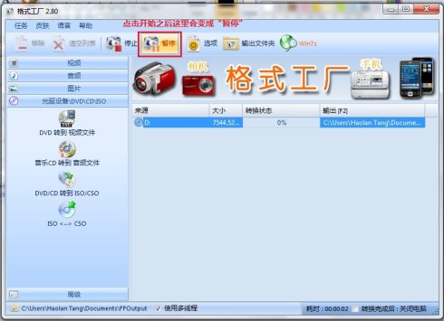 新文件会在My document下的FFOutput中生成,7G的文件会压制成大约1-2G