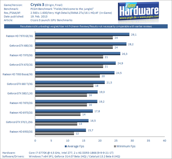 提高分辨率之后对显卡的要求也更高了,包括HD 7970 GE以及GTX 680在内的显卡都不到30fps。