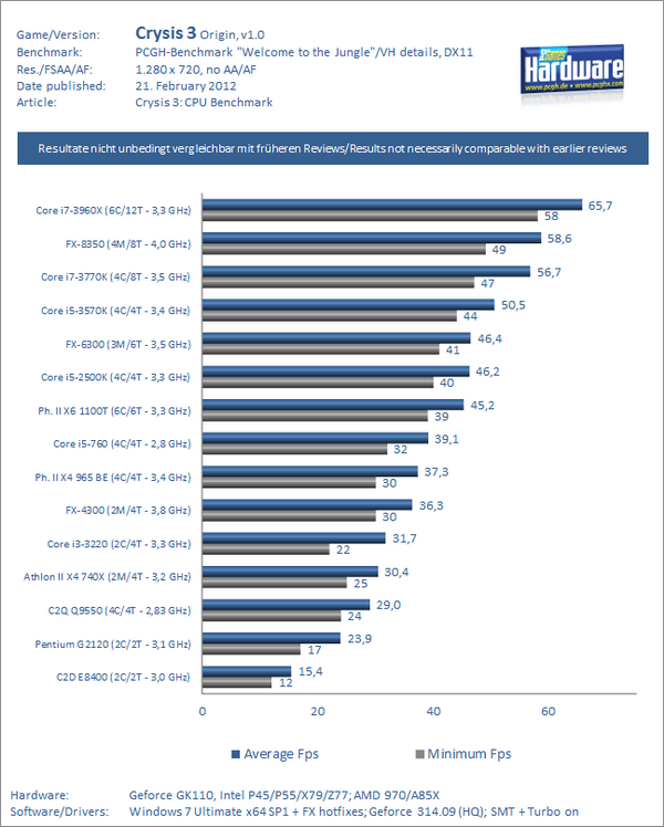 另外,PCGH的图表中没有列出缓存大小,实际上排名靠前的几个都是高缓存容量的,比如3960X的缓存高达15MB,FX-8350的L2+L3缓存也有16MB之多,他们的帧数排名都很靠前。