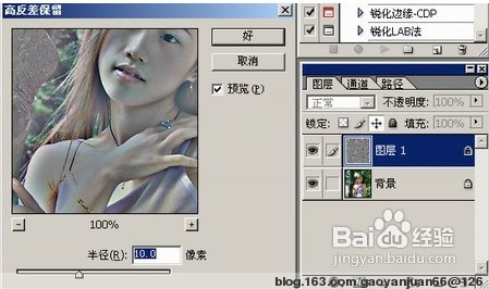 - 前面介绍了四个工具,其实锐化过程就是一个控制反差的过程,所以最有效的选择锐化方法之一就是应用图层+高反差保留滤镜。先复制一个图层,然后对复制图层用“高反差保留”滤镜,然后调整该图层的叠加方式,比如要色彩浓郁一些,可以用“强光”;要锐化一些用“柔光”;要更强的效果用“亮光”模式。