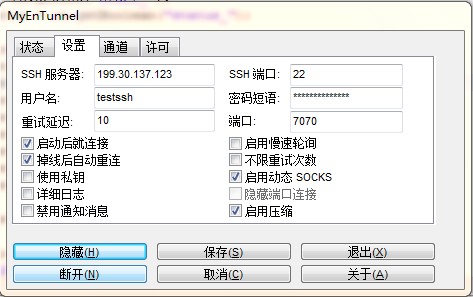 "myentunnel.exe",切换到"设定"选项卡,按下图设置即可:在这里,你一般需要修改 “SSH服务器”、“用户名称”和“用户密码”这3项,如果你所在的服务器 SSH 端口不是使用默认的 22 端口,则需要填入 SSH 端口;“本地端口 7070”指的是本机作为代理服务的端口,一般不作修改,但如果你本机的 7070 端口被其它服务占用,那么,你应该在这里填入一个其它的空闲端口。填写完成后,点击“保存”以保存你的配置到 MyEnTunnel 的配置文件中。