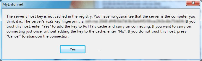 连接/断开你的 SSH 服务器,连接成功后,MyEnTunnel 的图标会由红色变黄,最终变为绿色,这个时候你就可以使用127.0.0.1:7070的本地代理端口上网了。第一次连接服务器时,会弹出对话框问你是否要保存密钥,选“Yes”,则将必要保存到注册表,下次连接就不会再提示;如果选“No”,则下次连接时还会继续提示。