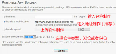 Step 2 –登入账户后,你可以直接输入需要制作绿色版软件的名称(估计只支持英文的了),或者输入软件安装程序的下载链接(不支持压缩包);或者自行上传软件程序。笔者建议使用第二种方式。点击Submit确认