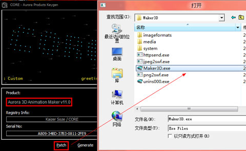 Step 3 –运行注册机,选择激活产品为Aurora 3D Animation Maker,点击Path,然后在弹出窗口中找到Aurora 3D Animation Maker的启动文件Maker 3D.exe,打开;