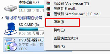 卸载ISO镜像文件很简单,你只需要右键单击虚拟光驱,选择右键菜单“弹出”。