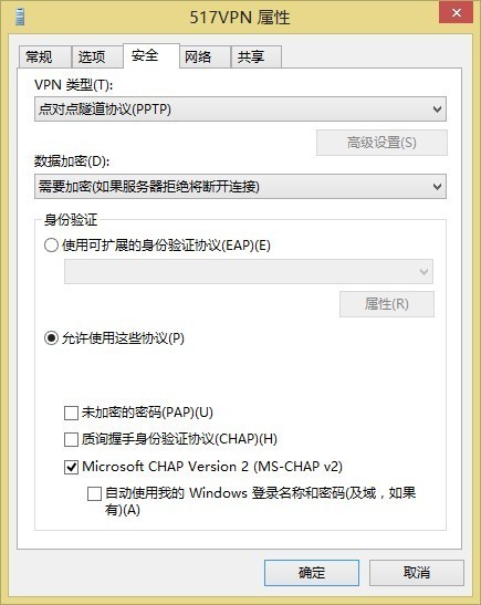 右键点击VPN链接后选择属性,然后在安全面板里如下设置: