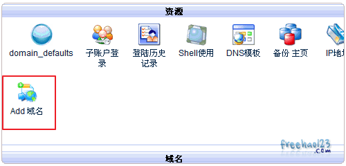2、进入Kloxo安装面板后,在“资源”中点击“添加域名”。