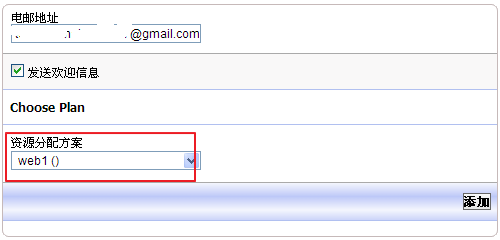 6、在创建用户时选择你已经创建的主机套餐,这样新用户产生后就可以使用你早已设定的主机空间了。