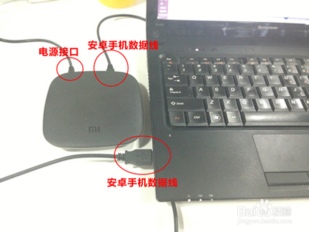 第二步:将小米盒子插上电源(重要,否则电脑无法识别),并用USB数据线将小米盒子连接到电脑