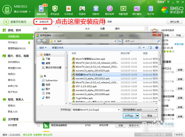 第一步:电脑上安装好360手机助手。(1代盒子腾讯手机管家、豌豆荚等都可以识别。新小米盒子目前只有360手机助手可以识别)
