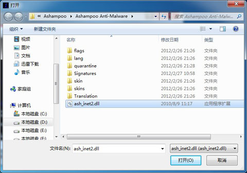 Step 3 – 弹出窗口提示要打开ash_inet2.dll文件,选择打开则可;