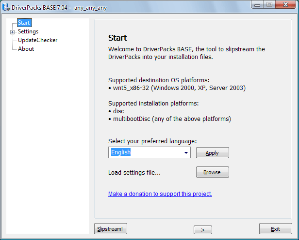 6. 在“设置-驱动包”中选中“DriverPack MassStorage 7.05”。这个软件也可以集成显示卡驱动、芯片组驱动等其它驱动,详细指南请访问http://forum.driverpacks.net/viewtopic.php?id=1449