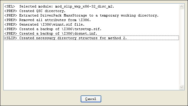 9. 点击“整合”按钮,程序会自动把驱动整合进Windows XP安装目录里。
