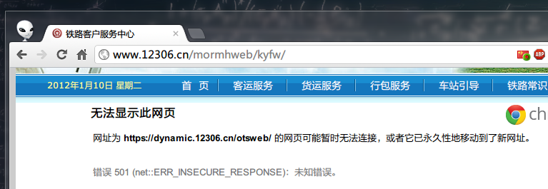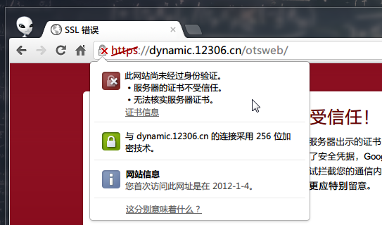 但是如果使用Chrome、Firefox或者IE8、9等浏览器都会显示这个网站的证书有安全问题。因为dynamic.12306.cn使用的是SRCA颁发的证书,这个证书在我们的计算机中是默认不被信任的,也就是不安全的。