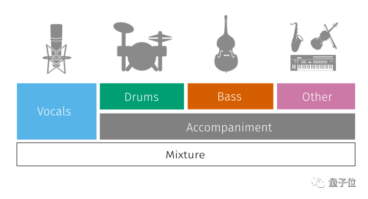 此外它还能把乐器声进一步分离为鼓、贝斯、钢琴及其他乐曲,加上人声,spleeter最多可以分离出5个音轨。