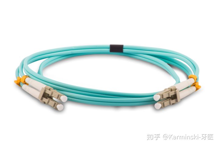 再如下图, 水蓝色, 这就是一个多模 OM3 光纤跳线 (光纤头上的白色是插头保护盖).
