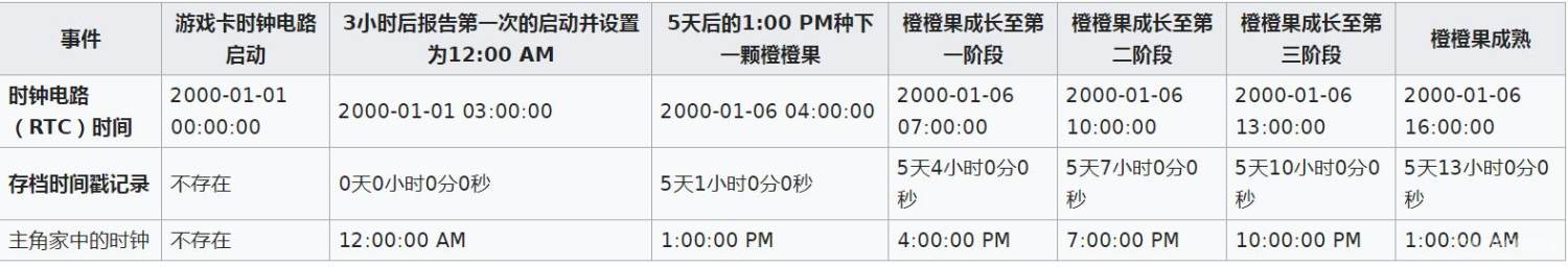 举个栗子:游戏卡的时钟电路启动后3小时(电路时间为2000年1月1日3时0分)玩家开始了新游戏,而玩家一开始在主角家中调整钟表的时间为上午12点(距离游戏内钟表默认时间上午10点相差2小时),并在此时存档,游戏会以此时作为“起始时间0时”开始计算游戏的经过时间,