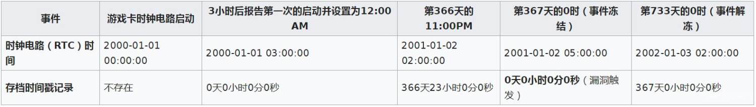 最终的结果就是:在“第366天”前触发的周期性事件和种下的树果,本应在“第367天”刷新和成熟,但由于时钟电路的“第367天”错误的变为“第1天”,因此所有事件的刷新和树果的成熟将因为没有到达重置的时间而被冻结,直到366天之后,时钟电路进行到“2002年1月2日”之后,存档时间戳再度累积到“第367天”到来的时候才会解除。 而游戏启动时时钟电路已经运行到2001年1月1日之后的存档则不会触发漏洞。
