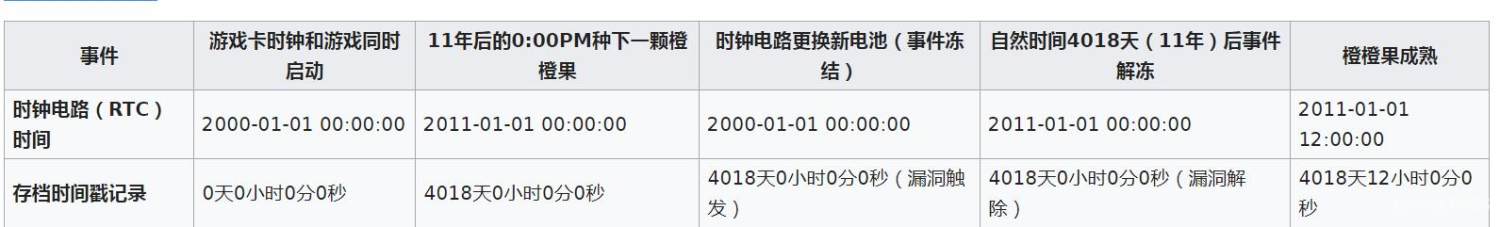 假设游戏的“起始零时”是时钟电路的2000年1月1日0时,而时钟电路已经走到2011年1月1日0时,时间戳则记录为4018天0时,此时种下一颗橙橙果,那么时间戳会设定下一次橙橙果成熟的日期是4018天12时。而假设此时电池突然耗尽,那么更换电池后,时钟电路回到了2000年1月1日0时,那么时钟需要再经过4018天12时,也就是11年零12个小时,这株橙橙果才会成熟,而且时间戳才会更新下一次事件的刷新时间。