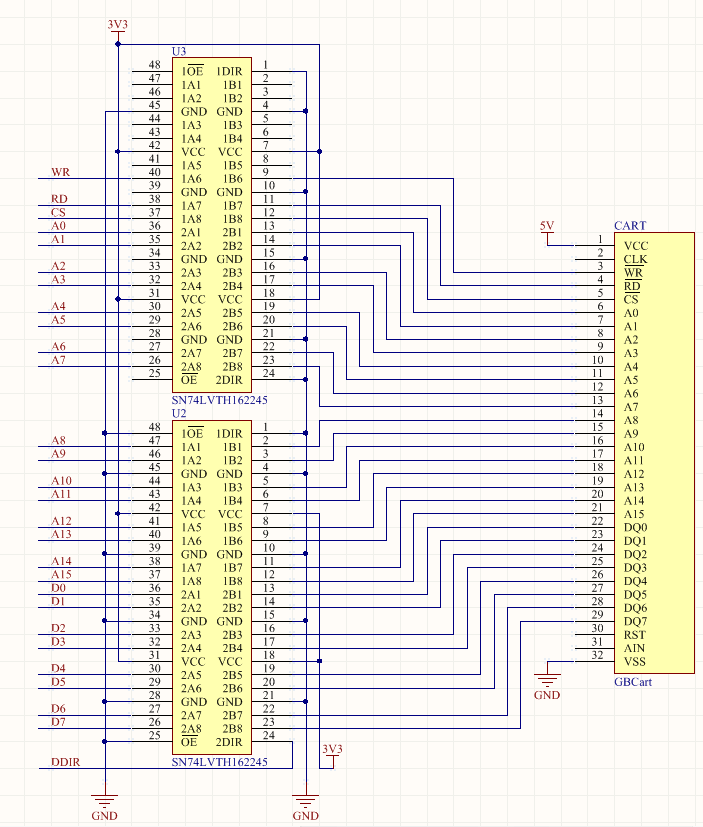 整体的设计并没有太多特殊的地方,就和计划的一样,在接口处连接总线驱动器实现电平转换。需要注意的是,RST信号并非由Game Boy输出给卡带,而是卡带输出给Game Boy。如果不需要复位Game Boy,这个引脚应保持浮空且不应用于复位卡带上的元件。AIN和CLK不使用。