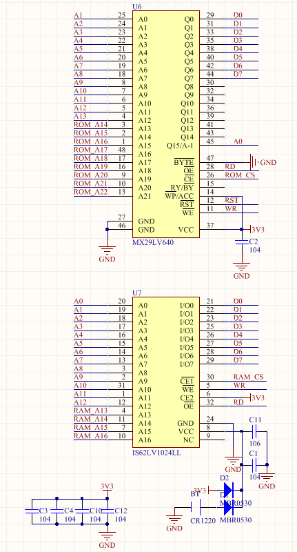 Game Boy使用5V电平,而CPLD为3.3V的IO电平,ROM和RAM也通常为3.3V的IO电平。为此,比较合理的方案是把整个电路设计成3.3V的,在接口部分加上总线驱动器以实现电平转换。