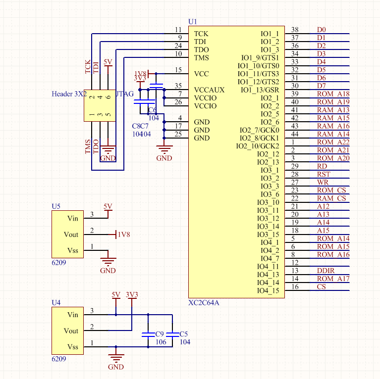 而CPLD部分则是连接上RAM和ROM的地址高位,Game Boy输出的控制信号,数据总线和一部分地址总线(任天堂的设计中MBC就是只有一部分地址线的,毕竟MBC本身也没有太多可以调整的寄存器。)CPLD除了需要3.3V IO电压之外,还需要一个1.8V核心电压,也使用一个LDO提供。CPLD通过JTAG接口烧写程序,记得留好焊盘或者测试点。