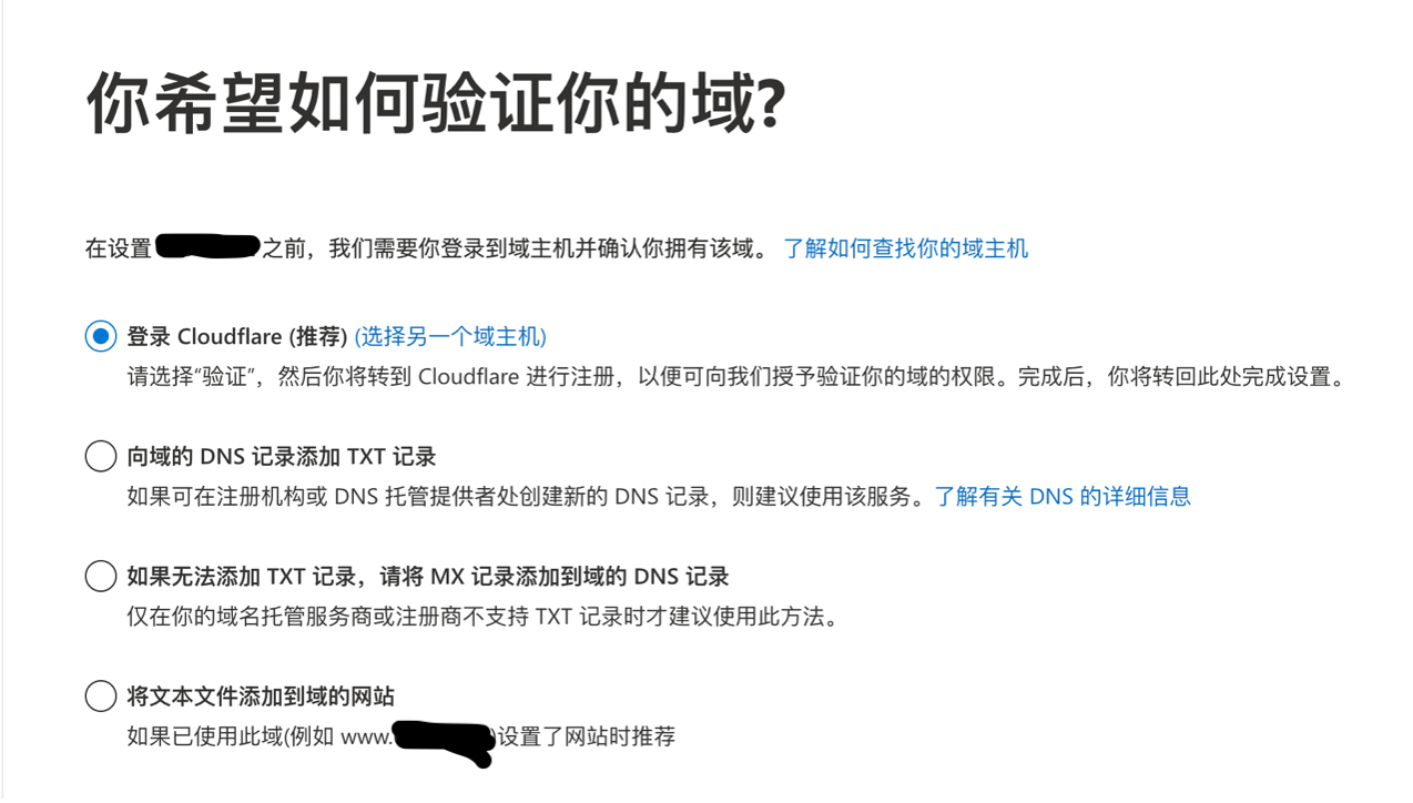 你可以使用任何一种方式验证,如果你使用了Cloudflare解析域名,可以直接选择登陆Cloudflare 他将自动在你的DNS中添加TXT验证,非常方便。