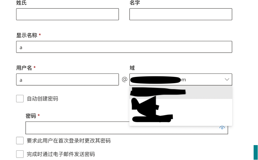 绑定成功后,“域”选项中除了全局默认的onmicrosoft域名外,你的域名也会出现在这里,第一步就完成了