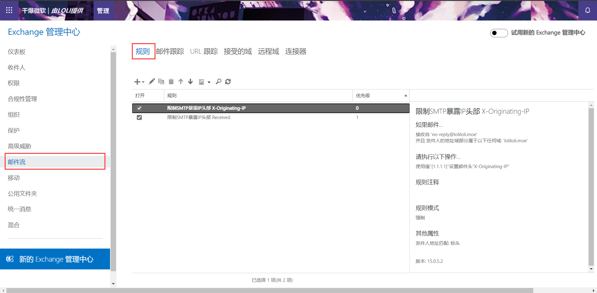 打开 Exchange 管理中心(旧版),选择“邮件流”,“规则”(如下图)