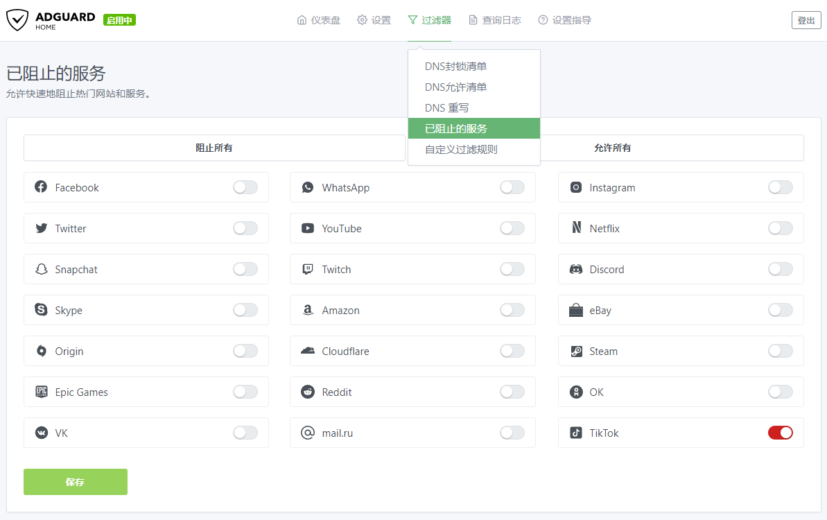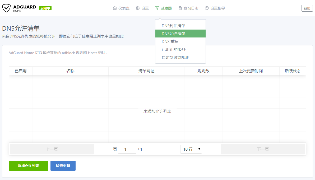 封锁清单这个词严重怀疑是机翻,而下面的绿色按钮是添加阻止列表。博主在查看 AdGuard Home 的源码后发现简体中文的翻译有很多不统一的地方,然后花了几个小时帮助他们改进了大量的翻译,可能在后续的版本中就不再叫封锁清单了。