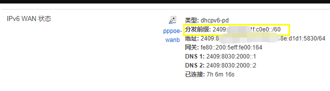 在IPV6环境,网内各设备均会获得一个全球地址,路由上可以通过ddns等工具最其自身所获取的wan6 ip实现域名绑定,并自动更新,但不能解决通过域名访问网内其它设备IPV6地址的问题,经过观察发现我们的路由获取的IPV6除了128位地址外还有一个PD前缀(移动为60位,电信为56位),如下图