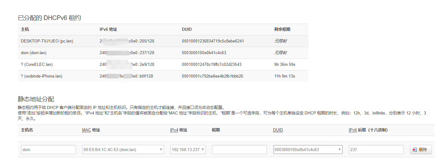 方框内填好后缀就行了,我习惯于用IPV4地址做后缀,其中DUID这个字段从“已分配的 DHCPv6 租约”里面找到对应关系选取。但此方式不建议,因为有时候并不会生效,会造成解析失败,建议后缀还是全地址(例如:2e0:b4ff:fe1c:4c63)